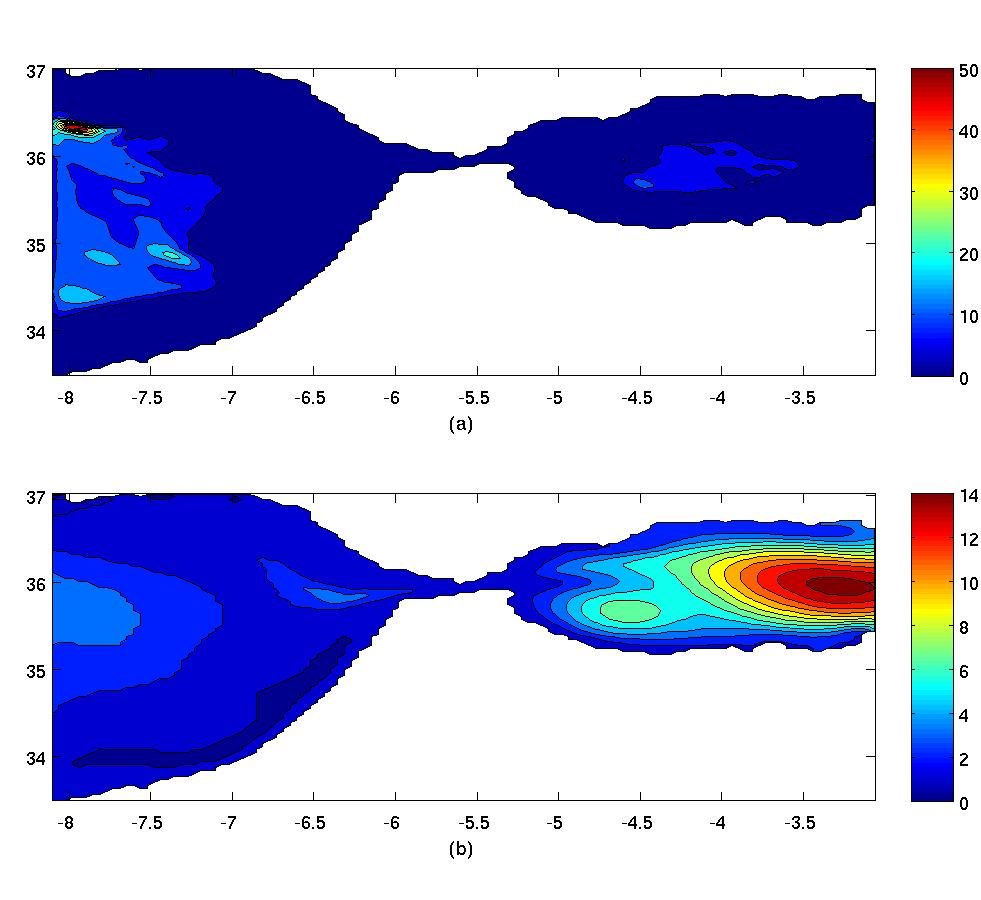 | Figure 8. Annual averaged eddy kinetic energy and sea surface height anomaly in the 1/24¢X resolution Gibraltar regional grid during year 20. (a) RMS velocity anomaly (root mean squared deviation of horizontal velocity from its time average) at 1000 m depth; bull¡¦s eye reflects turbulent wake of MOW flow diverted around mesa-like seamount seen in Figure 6(a). The unit of color contours is cm/s. (b) RMS of sea surface height deviation from its time average; dominated by the eastward low density MAW overriding the westward MOW through the Strait of Gibraltar, and the resulting energetic western Alboran Sea anticyclonic gyres and associated cyclonic eddies. The unit of color contours is cm. Longitude (¢X) is shown in x-axis while latitude (¢X) is shown in y-axis. |