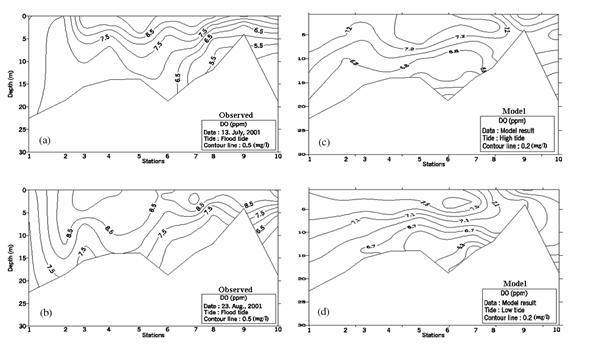 Fig. 2. Verification results of dissolved oxygen along the longitudinal section with observation data in (a) July, (b) August 2001 and (c, d) Model results.